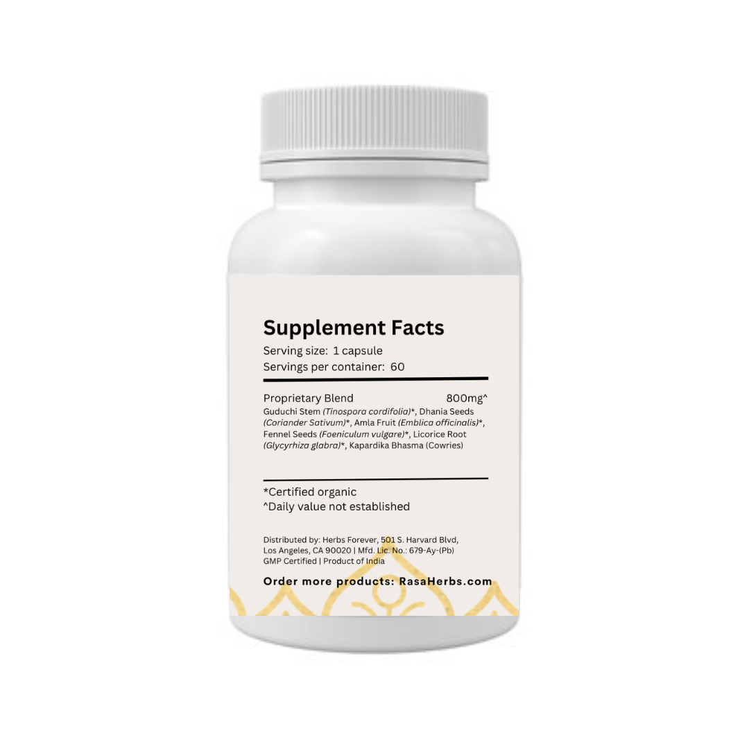 - Ingredients: Guduchi Stem (Tinospora cordifolia), Dhania Seeds (Coriander Sativum), Amla Fruit (Emblica officinalis), Fennel Seeds (Foeniculum vulgare), Licorice Root (Glycyrhiza glabra), Kapardika Bhasma (Cowries).