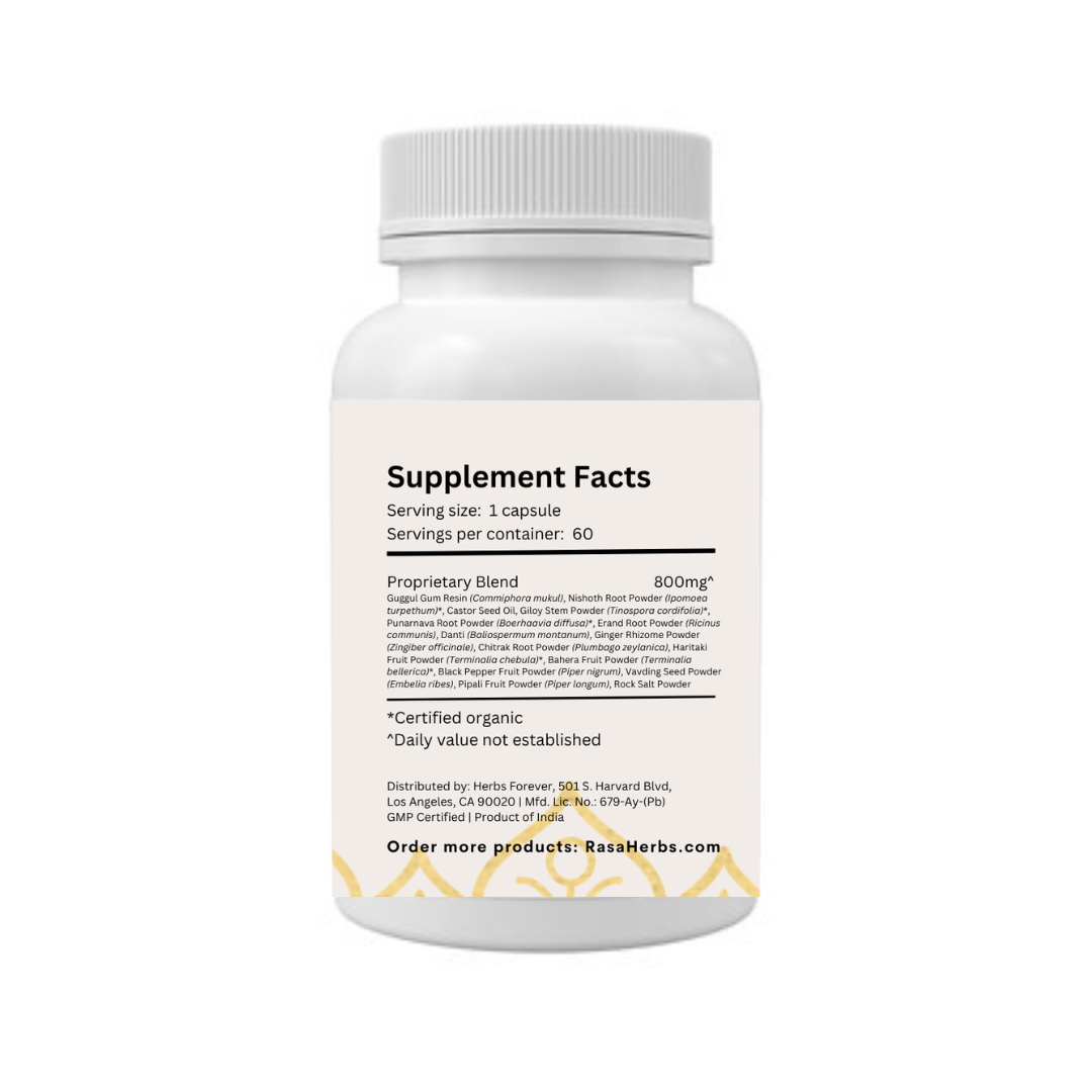 - Ingredients: Guggul Gum Resin (Commiphora mukul), Nishoth Root Powder (Ipomoea turpethum), Castor Seed Oil, Giloy Stem Powder (Tinospora cordifolia), Punarnava Root Powder (Boerhaavia diffusa), Erand Root Powder (Ricinus communis), Danti (Baliospermum montanum), Ginger Rhizome Powder (Zingiber officinale), Chitrak Root Powder (Plumbago zeylanica), Haritaki Fruit Powder (Terminalia chebula), Bahera Fruit Powder (Terminalia bellerica), Black Pepper Fruit Powder (Piper nigrum), Vavding Seed Powder (Embelia ribes), Pipali Fruit Powder (Piper longum), Rock Salt Powder.